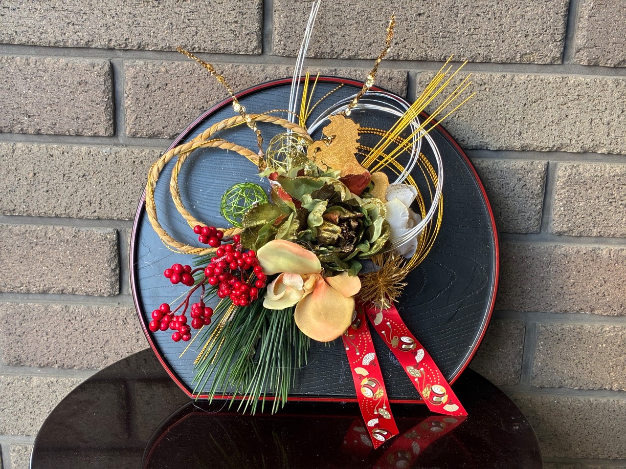 黒の半月盆を合わせシックに仕上げたお正月アレンジ。